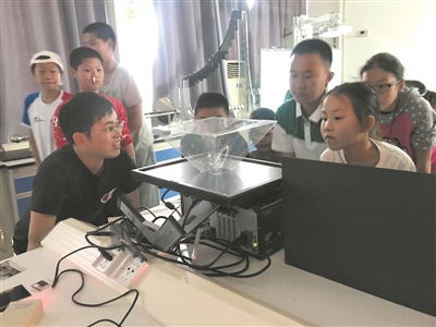 来自杭州市翠苑第一小学等9所小学的75名小学生日前走进杭州电子科技大学物理实验中心,在高校教师的指导下参观了动态窥视无穷、视觉暂留、引力透镜效应等演示设备和实验装置,了解物理在生活当中的应用。图为学生正在体验3D全息投影技术。(本报通讯员 尤素萍 摄)
