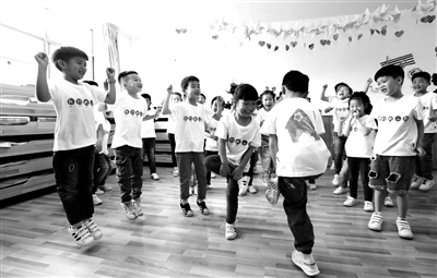近日,湖州市蓝天实验幼儿园的孩子们爱上了跳房子、七巧板、“母鸡下蛋”等传统游戏。原来,该园近来在全园范围内推广中国传统民间儿童游戏。图为大班孩子正在玩“斗鸡”。