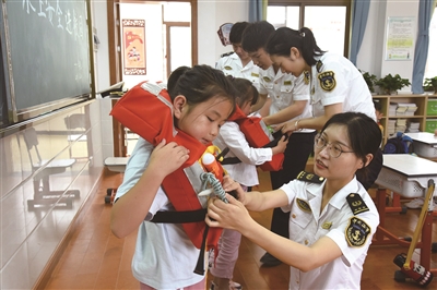 暑期来临,舟山市普陀山学校邀请普陀山海事处的专业人员来校为学生进行了一次水上安全知识讲座。通过讲座,学生知道了乘船出行的注意事项、海上自救的方法及如何穿戴救生衣等。图为学生在专业人员的帮助下,学习穿戴救生衣。