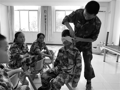 暑期,浙江建设职业技术学院的6名定向培养士官学员来到红旗仪表(长兴)有限公司,为员工子女开展为期一周的军事实践课,内容包括军人队列、急救常识、行为拓展训练和爱国主义教育等。图为士官学员在讲解简易包扎方法。 (本报通讯员 黄 暖 摄) |
