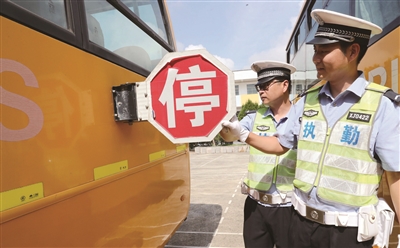 八月二十五日,在德清县上柏小学,该县交警大队舞阳中队执勤人员正在进行开学前的校车安全检查。
