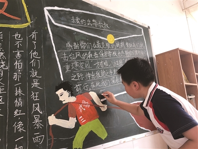 9月2日,乐清市大荆镇第一小学六(4)班的学生们绘制了主题为“台风无情,荆小有爱”的首期黑板报,把武警温州支队官兵和热心志愿者们在面对台风“利奇马”时不畏艰险、冲在一线抢险救援的经历以图文的形式绘制出来,以此表达对他们的感谢。图为学生正在绘制黑板报。