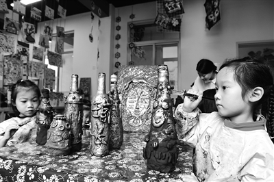 日前,在建德市莲花中心幼儿园美工坊里,孩子们将超轻黏土铺贴在酒瓶、脸谱、瓷缸等废旧物品上,随后用画笔涂上仿青铜颜色,制作成一件件富有创意的仿青铜美术作品。据悉,去年开始,该园开设了仿青铜创意美术园本课程。