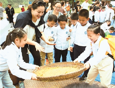 日前,上海新纪元武义双语学校的学生们来到武义县大山深处的上坊村,对他们春天播种下去的四亩多水田里的水稻进行收割。活动中,学生们把打下的稻谷运到指定晒谷场进行筛选、翻晒、扬谷,还开展了包括蔬果搬运等项目的趣味农耕运动会,共享秋收的喜悦。图为活动现场。(本报通讯员 韩增伟 摄)