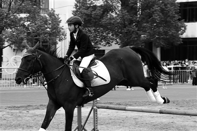 近日,在金华市第五中学运动会开幕式上,出现了激动人心的马术表演。表演者是来自初二(13)班的小骑手孔博文和他的教练。仅仅学习了一年马术的孔博文,已经收获了很多奖项:全国第二届青运会马术障碍赛第8名、浙江省马术锦标赛交叉杆项目冠军等。(本报通讯员 周宏勋 章超菁 摄)