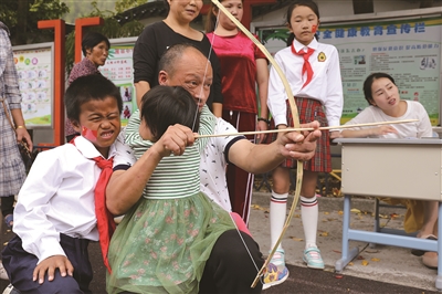 活动中,每一名学生都和他(她)的家长组成一个游戏小组。第一个游戏是竹箭射靶,学生们跃跃欲试,家长们颇为羞怯地拉弓,而后亲子齐心协力拉弓射箭。到了同舟共济环节,家长们就完全放开了。“一二一,一二一,加油!”只听见家长为孩子加油,孩子为家长加油,操场上的呐喊声此起彼伏。最后的拔河比赛,原本只需要6位家长参加,但家长们自发地全部上阵。那天,秋日阳光温煦,打照在家长和孩子们灿烂的笑脸上,连山风也动容。