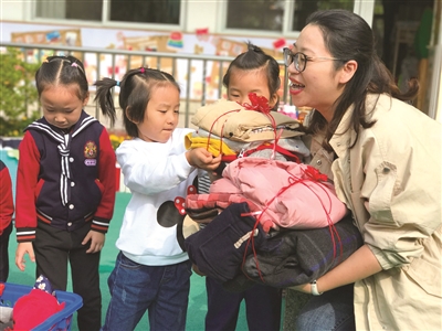 立冬至,地始冻。宁波市明楼幼儿园的师生向贵州省黔西南布依族苗族自治州幼儿园捐献冬衣。图为打包现场。(本报通讯员 胡谷怀 摄)