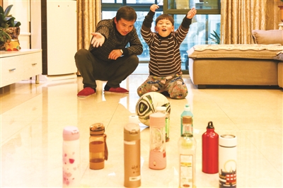 长兴县张家村花园幼儿园近期向幼儿和家长推荐了多个亲子游戏,图为该园一对父子在玩“保龄球一路向前”亲子游戏。
