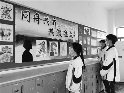 疫情期间,海宁市职业高级中学工美专业学生拿起画笔,争做疫情防控“宣传员”,向逆行先锋致敬。复学后,学生们将作品汇集起来,制作成“同舟共济,共渡难关”专题板报,增强战“疫”信心,鼓舞战“疫”斗志。