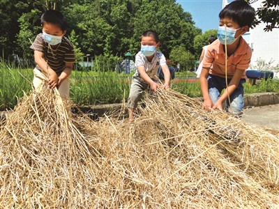 初夏时节,万物生长。义乌市一些学校借此契机,组织学生到户外开展劳动教育。该市现有40多个校园农场,到农场劳作学习已成为当地学校的一项传统。图为大陈镇中心幼儿园的孩子们在农场里为油菜籽脱壳。