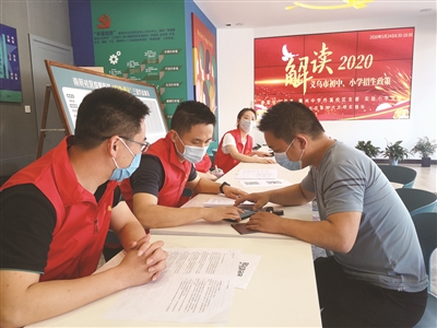 义乌市2020年义务教育段新生招生在即。连日来,该市教育系统优化服务方式,组织义务教育段各中小学党员教师志愿者走进社区,就当前家长最关注的问题作现场交流指导,让家长“带着问题而来,带着满意而归”。图为咨询现场。(本报通讯员 余雪光 摄)
