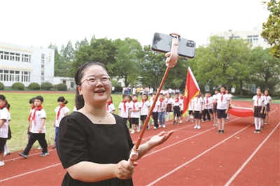 受疫情影响,今年湖州市吴兴区埭溪镇中心幼儿园通过直播的形式,让大班幼儿和家长足不出户,提前感受少先队员入队及一年级上课的氛围。图为大班年级组长林丽亚正在直播。(本报通讯员 何伟卫 摄)