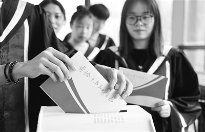 毕业季,又一批莘莘学子将离开校园。在告别母校之际,宁波职业技术学院2020届毕业生向时光邮箱投出了一封书信,寄语十年后的自己能勇敢担当、追逐梦想。图为毕业生投递书信的场景。