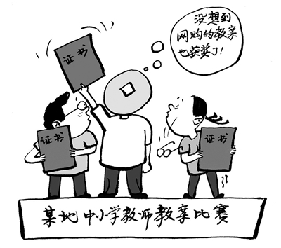 近日媒体报道,本该由教师根据教学大纲和学生实际精心设计的教案,却可以在网上花钱找人代写,享受“量身定制”服务。在百度搜索框中,打出“教案代写”,轻敲回车,瞬间就能找到近200万条相关结果。而月销数千单、零差评的网店不在少数。教师如果连教案都不愿写,谈何高质量的教学?(王 铎 绘)