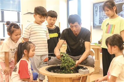 湖州市长兴县水口乡中心幼儿园近日邀请国家级非物质文化遗产——长兴紫笋茶制作技艺传承人郑福年走进校园,手把手传授孩子们手工制茶的工艺。茶乡娃娃们闻茶香、学手工炒茶,了解传统手工制茶技艺,乐学茶文化。