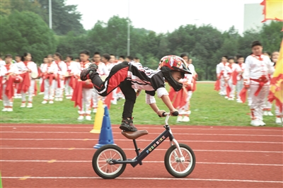 近日,建德市洋安幼儿园校园平衡车队在该市中小学生田径运动会开幕式上首次亮相,滑行、冲刺、漂移一气呵成……这些平均年龄5岁的小队员的表演获得了观众的热烈掌声。图为小队员在表演技巧动作“马踏飞燕”。