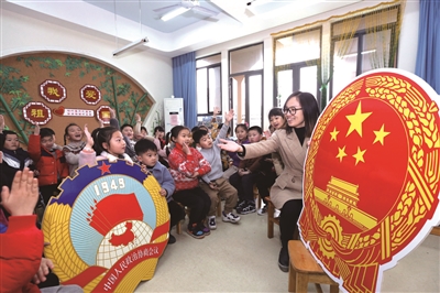 3月5日,德清县乾元镇开展“两会知识到课堂”主题教育活动,组织县、乡镇教育界的人大代表,为所在学校的孩子们普及两会知识。图为活动现场。