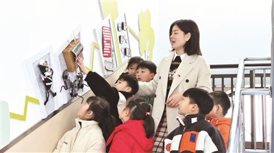 这学期,绍兴市越城区孙端街道中心幼儿园将“红色小故事”以图文并茂的形式呈现在楼梯间墙面。大班的孩子们边听故事边提问,对红色历史产生了浓厚兴趣。(本报通讯员 郑国娟 摄)