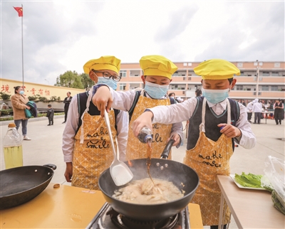 嚓嚓嚓的切菜声交织着滋滋的油锅声,头戴厨师帽,身系小围裙的学生进行着厨艺比拼。3月12日,新建小学举行了第四届校园美食节。在现场,该县市场监管所所长给各个班级颁发了营业执照、食品卫生许可证等;部分学生扮成小城管、小消防、小工商、小警察、小环卫,在广场上维持活动秩序;低年级学生开展系鞋带、叠衣服等生活技能比拼,拔得头筹的学生能得到德育积分,去兑换美食;高年级学生拿出十八般厨艺进行厨神争霸,还特设感恩宴,邀请退休教师、医护人员、消防员等一起品尝。