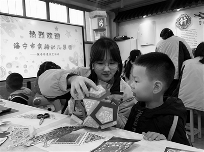 近日,海宁市职业高级中学硖石灯彩传承教学基地迎来了一群幼儿园小朋友。海职高师生手把手教小朋友制作灯彩,让他们在实践体验中感受“非遗”魅力。(本报通讯员 沈 恬 摄)