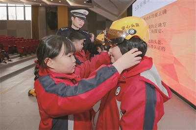 近日,湖州市新风实验小学开展“安全‘童’行”交通安全教育活动。湖州市公安局交警支队直属三大队交警走进校园,通过观看视频、趣味游戏、指导正确佩戴头盔等活动,带领孩子们学习交通安全知识,增强交通安全意识。(本报通讯员 陆一平 摄)