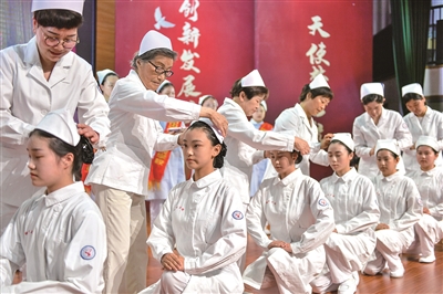 5月12日是国际护士节,湖州中等卫生专业学校举行了“传承·启航”护生授帽传烛仪式,由南丁格尔奖获得者邹瑞芳和援鄂校友一起为护理、助产专业的500余名学生授帽,并通过点灯传承、职业启航、重温誓言等环节,弘扬南丁格尔精神,传承仁爱护理匠心。(本报通讯员 谭云俸 摄)