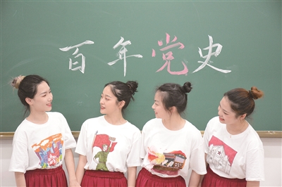 近日,浙江工商大学杭州商学院开展了衣服DIY——为建党100周年献礼活动。白描、漫画、写意……学子们以知党、敬党、爱党之情为基础,在衣物上绘制出一幅幅独特的画作。完成画作后,学生们还穿上DIY的衣服逛起了校园,希望让更多的人了解党史、认识党史。(本报通讯员 苏 杭 李全泽 摄)