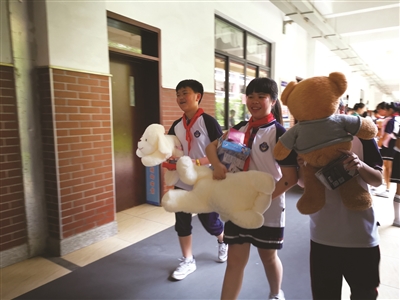 毕业季,积分大换购。6月29日,温州市洞头区实验小学毕业典礼后,六年级学生用自己得到的奖励积分换购奖品。不同的积分摊位,有100积分的旅行箱、50积分的大玩偶,还有各种各样的学习用品和玩具。该校不同学科发布5种积分,分别是艺术星、智慧星、创造星、健康星、文明星,指向学生日常行为的5个维度评价。每位学生都怀抱着满满礼物,笑容满面。这是母校给予即将启程的毕业生温柔的祝福。(本报通讯员 董芳蕾 摄)