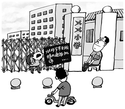 近日,河南洛阳市中小学推迟学生上课时间,这与家长上班时间“冲突”。有家长为了上班不迟到,早早地将孩子送到学校,却被通报批评,因此只能让孩子在校门外等待开门。推迟上课时间的目的是保证学生有充足睡眠,学校、教师不能以违反制度为由行减轻管理压力之实,“一刀切”地拒绝早到学生入校。对确有难处的家庭,学校制订人性化的方案加以应对才是正道。 (王 铎 绘)