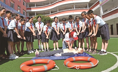 7月7日,仙居县红十字会与仙居县第一小学联合开展“暑期防溺水安全教育”进校园活动,红十字志愿者为即将放假的学生进行心肺复苏等紧急救护知识培训,提高学生的自救互救意识和能力,让学生度过一个平安的暑假。图为志愿者向学生传授心肺复苏急救方法。(本报通讯员 王华斌 摄)