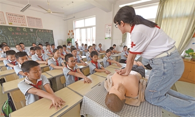今年的9月11日是世界急救日,主题是“做学校社区的急救英雄”。9月10日,仙居县红十字会与仙居县第一小学联合开展“急救知识进校园”活动,红十字志愿者向学生们传授心肺复苏、包扎等应急救护常识技能。(本报通讯员 王华斌 摄)
