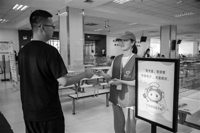 中国计量大学2021级新生报到当天,学校餐厅发放免费美食券4600张,奖励认真践行“光盘行动”的师生。不少新老学子都做到了“光盘”不浪费,如期领到了食堂精心准备的美食礼包。该校学生纷纷表示会用行动支持“光盘”,“这不仅不过时,还应成为学校餐饮文化的新时尚”。图为志愿者在食堂入口处发放美食券。(本报通讯员 陈晨雨 摄)