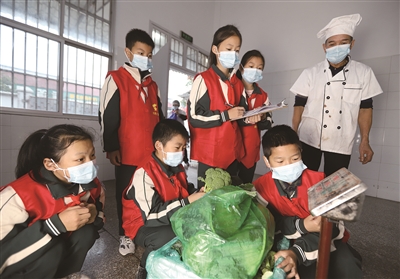 日前,武义县泉溪镇中心小学校园里刮起了一股“清廉”风。一群“清廉”小监督员活跃在校园各个角落,参与“双减”“五项管理”等校务监督。图为小监督员参与食堂菜品验收。
