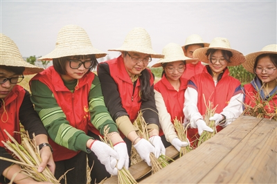 近日,绍兴市柯桥区豫才中学把劳动实践课开到了田间地头——青年团员在教师的带领下,参与“新青年下乡”志愿者服务活动,与村民一起收割水稻、捆扎秸秆、采摘玉米,体验劳动的艰辛和收获的喜悦。图为师生正用打稻机加工稻谷。