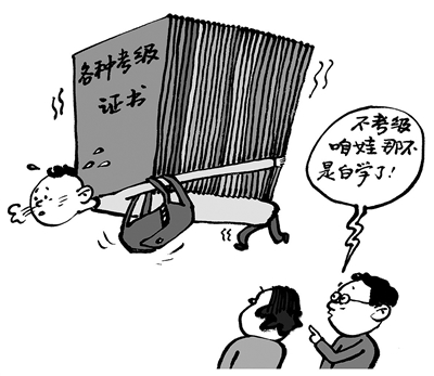近日《法治日报》报道,眼下,家长除了要求孩子学习成绩要优异之外,艺术兴趣也不能落后。学了就要考级拿证书,成为孩子们上兴趣培训班默认的归宿。一些家长表示,“不考级就是白学了”。这其实是家长观念上的误区,证书是附属品而不是必需品,何况很多考级实际上就是“花钱买证”,套路满满。不要让本来是为培养孩子兴趣的艺术班,变成家长为了谋求艺术等级证书而强加于孩子的另类负担。(王 铎 绘)