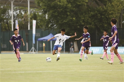 9月2日,浙江省第十七届运动会足球(男子丙组)比赛在东阳市开赛,有来自杭州、宁波、温州等地的10支队伍共210人参赛,比赛持续到9月10日。图为金华代表队和台州代表队正在激烈角逐。