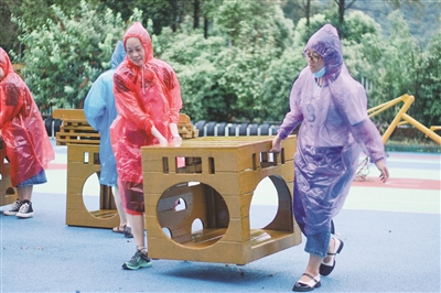 今年第11号台风“轩岚诺”给浙江多地带来大风暴雨。为筑牢抗台防线,我省多地教育系统积极行动,有序做好抗台工作。图为舟山市普陀区龙山幼儿园的教师们正在紧急转移户外器械。