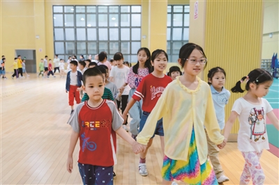 在宁波市镇海区实验小学,为期2周的新生适应课程被称为“软着陆”课程,内容有课堂常规、绘画天地、队列训练、写字指导、国学启蒙等。而陪伴一年级新生的,除了带班教师,还有五年级学生。他们与一年级新生结对,手牵手一起行走在校园里,带新生熟悉各个功能教室,为新生解答学习生活上的各种疑问。