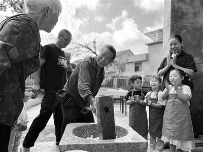 今年10月4日是重阳节,节日前夕,缙云县双溪口乡中心幼儿园师幼走进敬老院开展“香甜麻糍,温暖重阳”活动。图为幼儿和老人体验打麻糍。(本报通讯员 樊锦丽 摄)