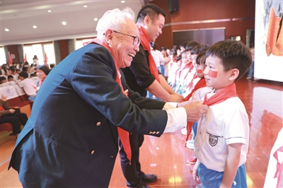 “时刻准备着!”近日,温岭市方城小学举办“献礼二十大,争做好队员”少先队员入队仪式,一年级的400多名学生戴上红领巾,光荣入队。图为温岭市少先队终身总辅导员俞明德给新队员戴上红领巾。