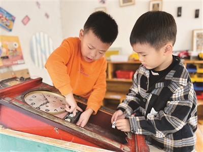 日前,义乌市佛堂镇江滨幼儿园里的修理铺开张了。幼儿们可以在这里学习修玩具汽车、家用小电器,尝试用废旧零件制作新玩具。“孩子们喜欢‘搞破坏’,这在生活中常常不被允许,其实他们是在探究物品内部的结构。”园长冯晶晶说,开设这个修理铺就是想要保护幼儿们的好奇心,为他们搭建一个动手动脑的平台。图为幼儿在修理大钟。