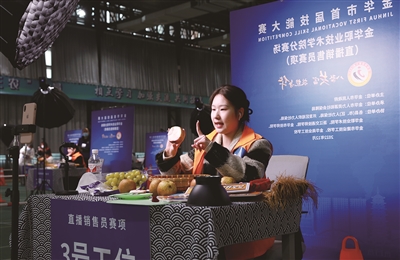 日前,金华市举办首届技能大赛。金华职业技术学院作为分赛区,承办了工业机器人、机床装调维修工、数控铣工、直播销售员和养老护理员5个工种项目的比赛。图为直播销售员赛项现场。