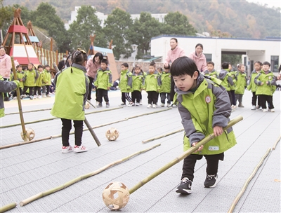 12月15日,宁波市奉化区萧王庙街道中心幼儿园举行了一场竹趣运动会。图为小班幼儿在比赛赶竹球。