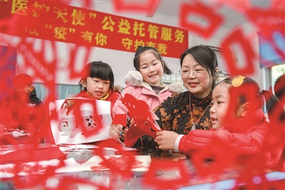 寒假期间,长兴县组织开展了“医护天使”公益托管服务,该县第一小学和青少年宫的教师志愿者为60余名医护工作者的孩子提供为期两周的日常看护。图为孩子们在体验新年主题传统非遗手工剪纸。