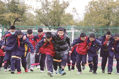 开学以来,湖州市吴兴区戴山学校利用大课间和课后服务等课外时间,开展形式多样的体育活动,丰富学生的校园生活。学校将“和乐”文化贯穿于“趣动”课程中,花样跳绳、趣味足球、“两人三足”等活动寓游戏于体育中,深受学生欢迎。图为2月22日,学生在大课间玩“两人三足”游戏。