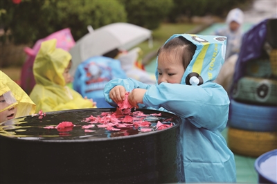 春雨绵绵,诸暨市暨南街道街亭幼儿园的幼儿们或穿上雨衣、雨鞋,或撑着小伞,在教师的带领下愉快地穿梭在雨中,这边踩踩小水花,那边看看雨里的花花草草,与雨天亲密接触,与春天相遇,感受大自然的馈赠。(本报通讯员 陈霞芳 摄)