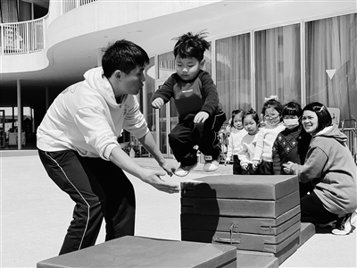 近日,杭州市临安区锦城街道新城幼儿园举行了一场以“迎亚运育美好”为主题的亲子早教活动,主要面向社区三周岁以下幼儿定期开放。图为教师引导幼儿尝试“跳台阶”项目。