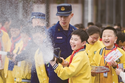 近日,绍兴市柯桥区实验小学联合青少年宫、消防大队开展“119,我们的生命热线”主题活动。学生们不仅认识了消防器材,观看了消防员高空救援展示,还参与了10多项消防体验项目,并用“勇敢分”兑换到了消防车模型。图为学生在消防员的指导下体验高压水枪喷水。