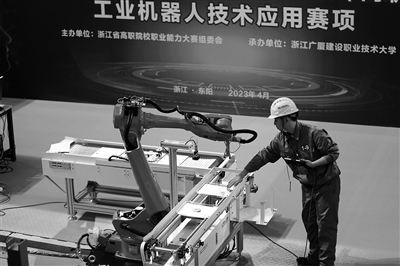 近日,2023年浙江省职业院校技能大赛(高职组)工业机器人技术应用赛项在浙江广厦建设职业技术大学开赛。来自全省13所院校的35支代表队参赛。比赛项目包含工业机器人应用工作站系统中的配套设备机械电气系统的装调、工业机器人标定及示教器示教编程、通讯设置及操作编程等基本工作任务,并通过对系统的人机界面开发及控制程序设计等完成工业机器人智能工作站系统的联机运行和特定制造流程等综合任务。(本报通讯员 胡扬辉 黄海燕 摄)
