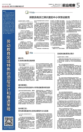 2022年4月,教育部印发了《义务教育课程方案(2022年版)》,将劳动从原来的综合实践活动课程中完全独立出来。2022年秋季开学后,劳动课正式成为中小学的一门独立课程。而自2020年以来,浙江就已在探索具有浙江辨识度的劳动教育模式,在劳动教育的课程体系构建、资源建设、项目开发、创新评价、创新教研等方面进行尝试,以推动劳动教育在浙江落地落实。《前沿观察》将分两期就劳动教育的区域推进和学校实践做一介绍。本期关注——